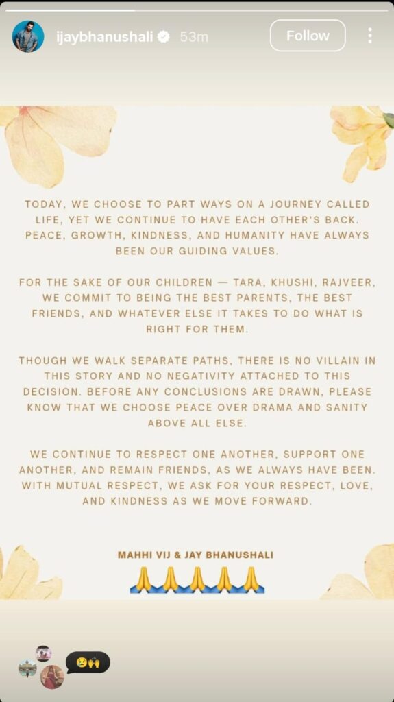 In his statement, Jay stressed that their priority remains their family. The couple said, “For the sake of our children, Tara, Khushi and Rajveer, we commit to being the best parents, the best friends, and whatever else it takes to do what is right for them. Though we walk separate paths, there is no villain in this story and no negativity attached to this decision. Before any conclusions are drawn, please know that we choose peace over drama and sanity above all else.”