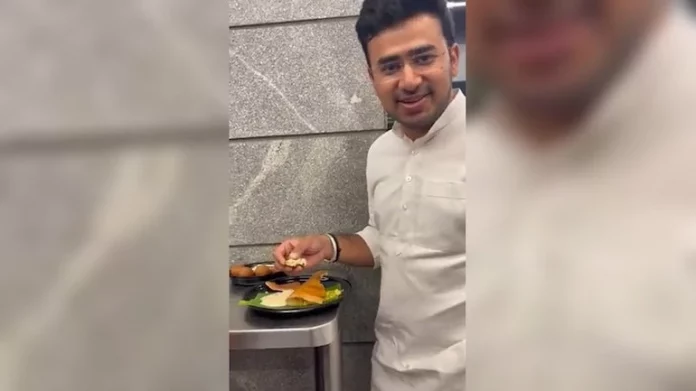 Actually, a 40-second video has become public, in which BJP’s Yuva Morcha national president Surya is seen sitting in a hotel in Padmanabha Nagar, eating butter masala dosa and utpam and praising the taste and quality of the dish. In the video, the MP has also urged people to come there and enjoy the delicious food.