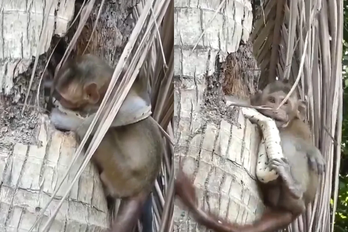 The viral video posted on X begins with the monkey peacefully sleeping on the top of a coconut tree. Little did the poor baby know that the tree was housing the dangerous reptile within. As the snake slowly spreads its tail across the body of the money, its sleep breaks, and the struggle for survival begins.