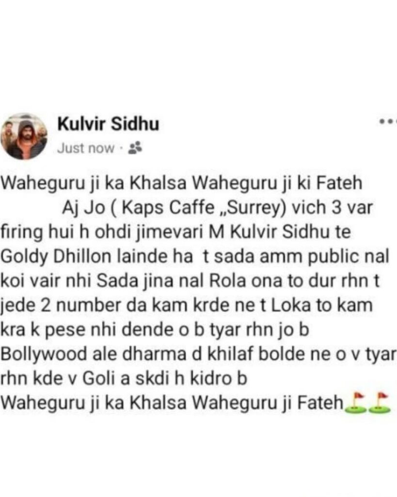 Goldy Dhillon and Kulveer Sidhu posted online – “Waheguru Ji Ka Khalsa, Waheguru Ji Ki Fateh. We, Goldy Dhillon and Kulveer Sidhu, take responsibility for the three rounds of firing at Kaps Caffe in Surrey today. We have no enmity with the public. Those who have issues with us should stay away. People who do illegal work, cheat others for money, or speak against religion in Bollywood should also be prepared. Bullets can come from anywhere.”