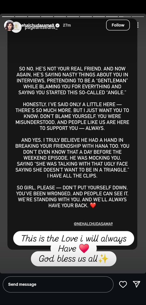The post further alleged that Baseer had called Nehal “manipulative” and warned Farhana Bhatt against being friends with her. It also claimed that Baseer had played a key role in the “halwa incident” and even planned to make Nehal’s life difficult during Amal’s captaincy. The message ended by suggesting that Baseer was the one who created the ‘fake love angle’ for attention, and not Nehal.