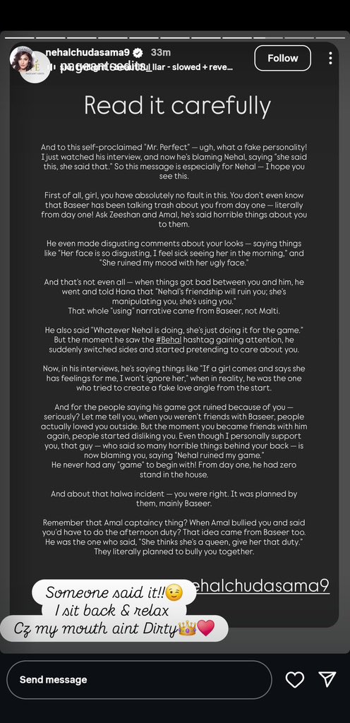 The reshared post slammed Baseer for allegedly badmouthing Nehal during the show. It claimed that Baseer had spoken negatively about Nehal’s looks and character to other contestants, including Zeeshan and Amal. The post also accused him of saying “Her face is so disgusting, I feel sick seeing her in the morning,” and “She ruined my mood with her ugly face.”