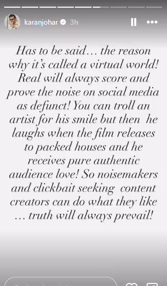 Karan Johar did not hold back while responding to the trolling. He wrote that social media users can troll an artist for his smile, but then he laughs when the film releases to packed houses and he receives pure, authentic audience love.