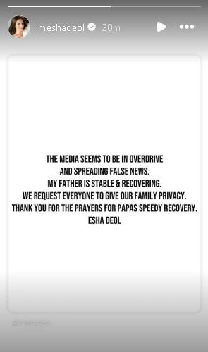 However, his daughter Esha Deol posted a story to refute the rumours and confirmed that he is stable. She wrote, “The media seems to be in overdrive and spreading false news. My father is stable and recovering. We request everyone to give our family privacy. Thank you for the prayers for Papa’s speedy recovery.”