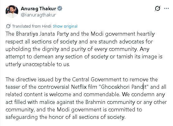 Thakur said the Modi government respects all sections of society and stands firmly for the dignity of every community. He stressed that any attempt to insult or defame a group (including the Brahmin community) crosses a red line. According to him, creative freedom cannot be used as an excuse to hurt social sentiments, and the Centre’s action was both necessary and justified.