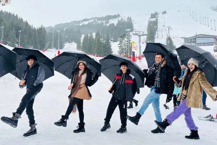 Hrithik Roshan took to his Instagram handle to share a cute picture of him with his family. In the picture all of them are striking the iconic pose from the popular film ‘Hum Saath Saath Hai’. Hrithik is dressed in a black coat paired with blue denim, black boots and a grey scarf. Girlfriend Saba Azad is standing next to him. She is wearing purple coloured tracks with a light brown coloured fur jacket and black boots. The family posed for the photo in the snow holding black umbrellas and looking happy as all of them smile.