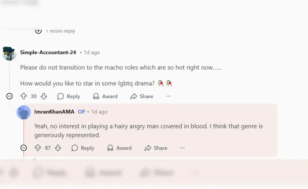 The discussion started when Imran hosted a no-filter AMA (Ask Me Anything) on Reddit. During the chat, one fan requested him not to follow the trend of aggressive action roles. The fan wrote, “Please do not transition to the macho roles which are so hot right now…….”
