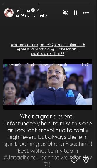 Soon after, Sonakshi addressed it herself. Zee Studios shared a highlight video from the event on Instagram, and the actress reposted it with a heartfelt yet quirky note explaining why she could not join the celebrations. She wrote, “What a grand event. Unfortunately, had to miss this one as I couldn’t travel due to a really high fever…But always there in a spirit looming as Dhana Pisachini. Best wishes to my team #Jatadhara. Can’t wait for Nov 7.”