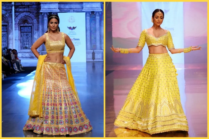 Malaika Arora and Hina Khan: The season of new Fashion and style has just Begun with the commencement of Bombay Times Fashion Week 2022! The three-day-long extravagant Fashion event is going to witness a bunch of celebrities, who are going to showcase their designers’ collections and walk on the Ramp as showstoppers. Meanwhile, on the first day of the Times Fashion Week we got to witness two Indian beauties, that is Malaika Arora and Hina Khan flaunting their yellow beautiful Lehenga. While Hina walked for Bhawna Goenka. On the other hand Malaika Arora, showcased Gopi Vaid’s festive collection and looked Mesmerising as always! But what caught everyone’s attention was their yellow Lehanga. In this Fashion Face off, let’s compare their outfits.