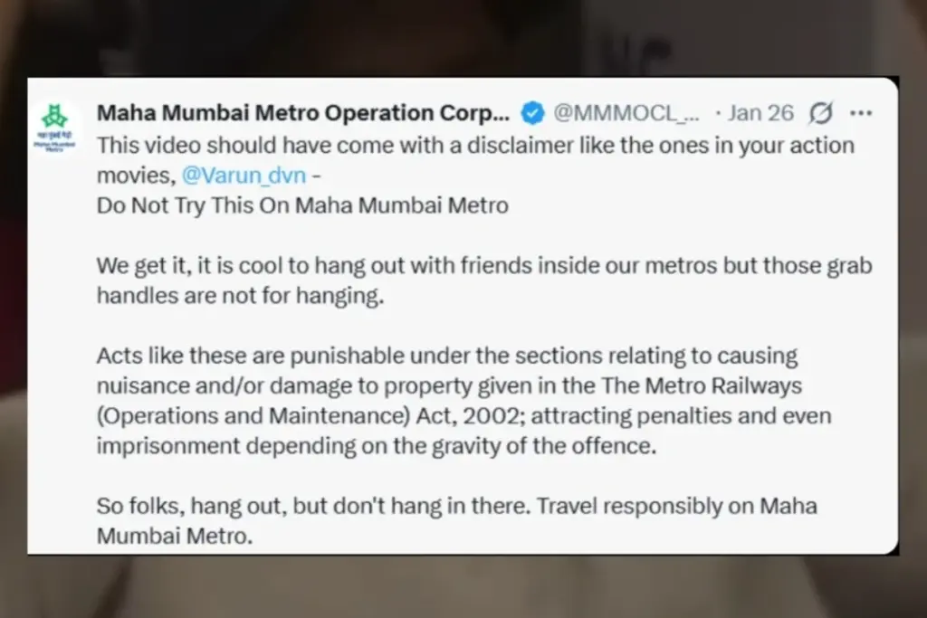 Mumbai Metro and Bollywood actor Varun Dhawan landed in the spotlight after a video of the actor inside a metro coach went viral and sparked safety concerns. The video showed Varun hanging from grab handles inside the coach, which quickly triggered criticism online. Soon after, Mumbai Metro authorities issued a public warning. However, the post has now been deleted, and Varun Dhawan’s team has clarified that no fine or penalty was imposed.
