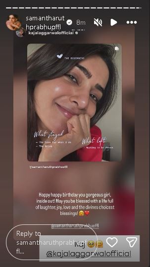 Kajal Aggarwal posted a lovely picture of Samantha on her Instagram Stories and wrote, “Happy happy birthday you gorgeous girl, inside out! May you be blessed with a life full of laughter, joy, love and the divines choicest blessings.”