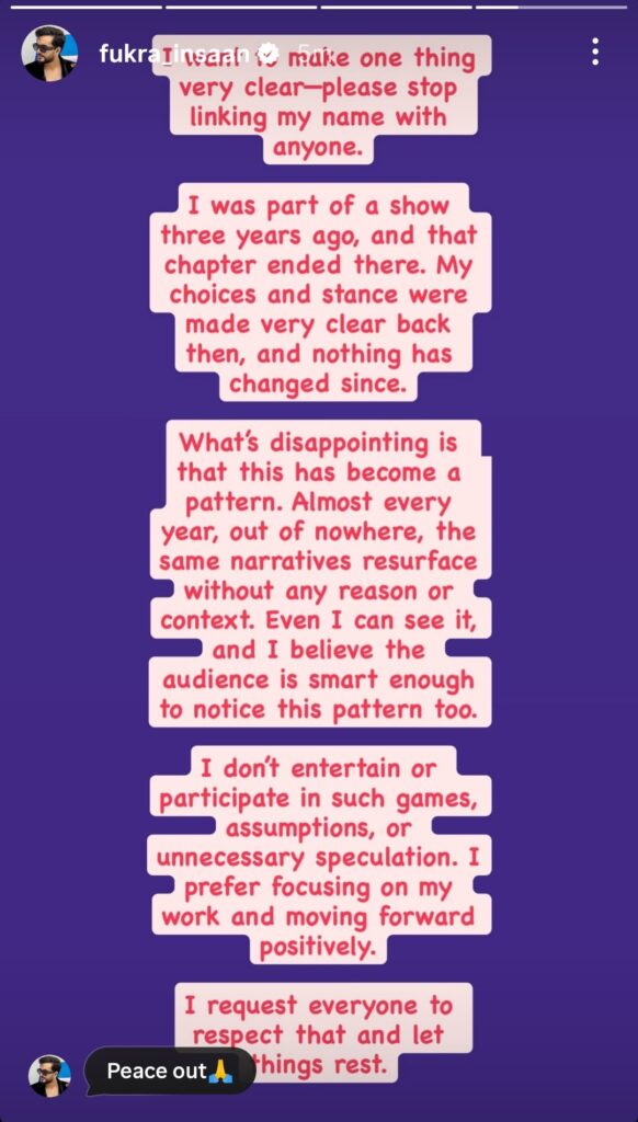 Abhishek addressed the issue through his Instagram Stories. His message was direct and emotional. He made it clear that he is tired of the same rumours returning every year. He wrote, “I want to make one thing very clear – please stop linking my name with anyone. I was part of a show three years ago, and that chapter ended there. My choices and stance were made very clear back then, and nothing has changed since.”