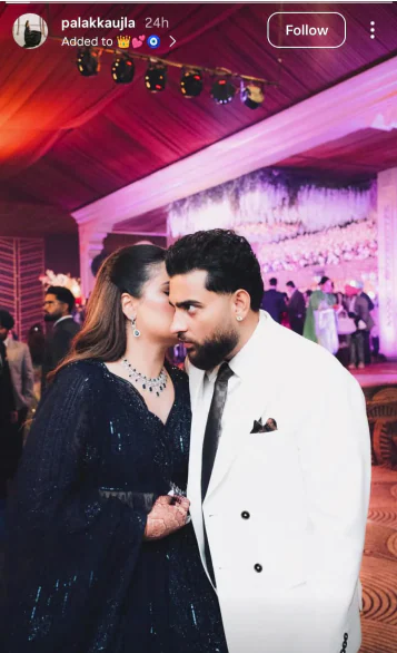 While Karan stayed away from public comments, Palak Aujla expressed her stance through social media. She shared a set of romantic photos with her husband on Instagram Stories. In one picture, the couple is seen standing close together at what looks like a public event. In another, Palak leans towards Karan, who is dressed in a white suit.