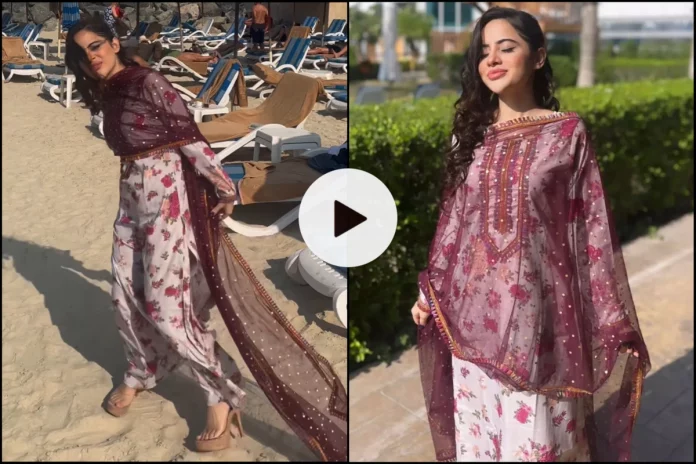 In the latest video, Urfi Javed was spotted at a beach in Dubai and wore a white printed suit with a burgundy colour dupatta. She further flaunted beige colour heels, and went for an open-hair look and pink nude makeup.