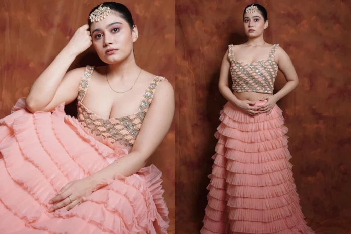 In the latest video, Urusa Javed was spotted wearing a pink pastel ruffled Lehenga, where the blouse had a sequenced silver work on top. She further wore a thin golden chain and carried a big golden and peal mix ‘Maang Tika’, to compliment the attire. The blouse had a plunging neckline, and no dupatta was added with the Lehenga. The hairdo was kept Simple, with a low bun. And as for the Makeup, she opted to go for a pink nude one.