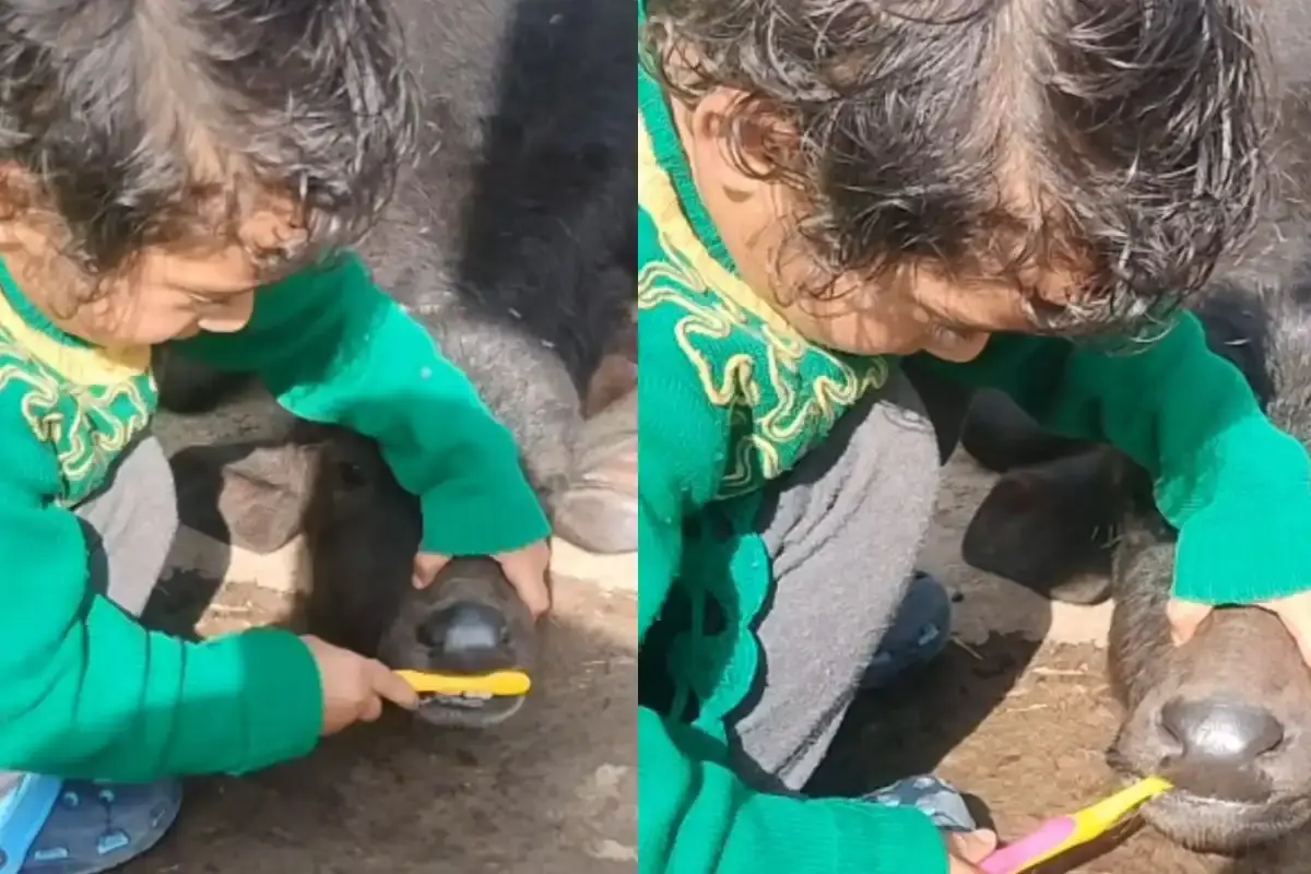 In the video, the young girl can be seen brushing the buffalo calf’s teeth while talking to herself. She keeps on saying funny and random things that make the entire moment even more pure, innocent, entertaining and refreshing. At a point, the young girl struggles to pull the toothbrush out of the young calf’s mouth. Later on, she manages to remove it after a little effort and then continues brushing the other side.