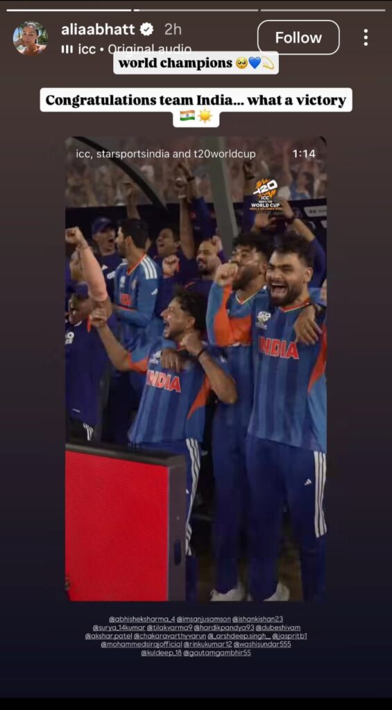 T20 World Cup Win: Alia Bhatt wrote a happy post to celebrate the win that fans loved right away. Her short but impassioned address captured the mood of the country.