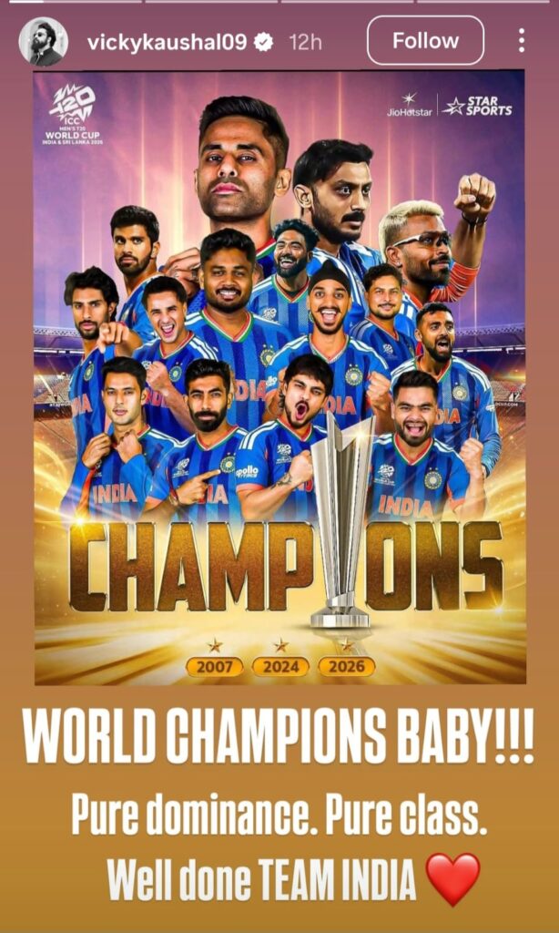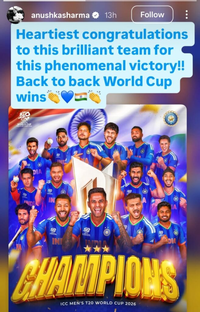Anushka Sharma congratulated the team by sharing a special message on her Instagram Stories. She wrote, “Heartiest congratulations to this incredible team for this phenomenal victory!! Back-to-back World Cup wins,” along with clapping, blue heart, and Indian flag emojis.