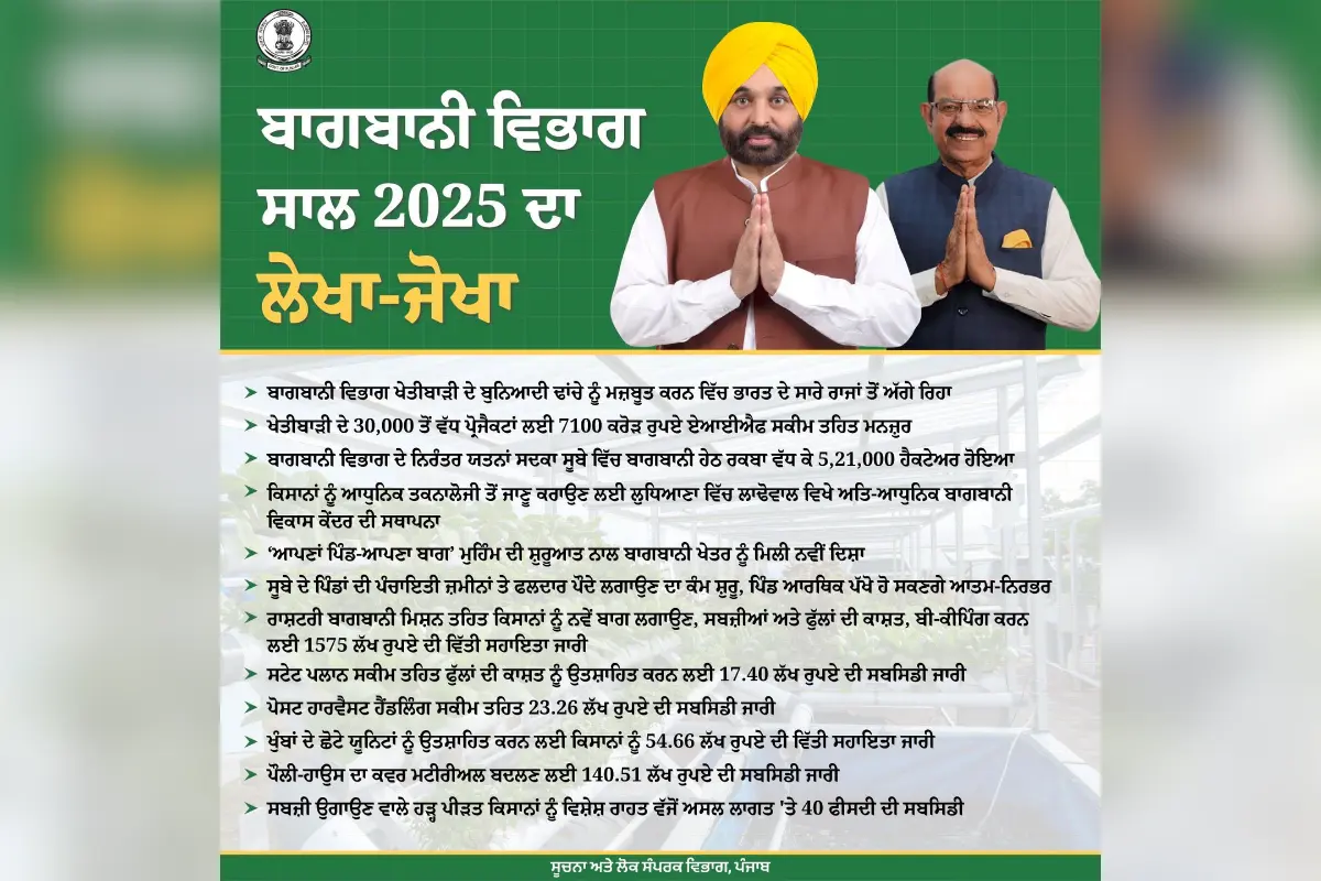 Under the leadership of Chief Minister S. Bhagwant Singh Mann, the Punjab Government has intensified efforts to expand the horticulture sector and enhance farmers’ income across the state . Working under the directions of Horticulture Minister Shri Mohinder Bhagat, the Horticulture Department is encouraging farmers to move beyond traditional crops and adopt crop diversification through policy support, financial assistance and modern technology. During 2025, the Horticulture Department achieved several significant milestones and emerged as a frontrunner at the national level in strengthening agricultural infrastructure.