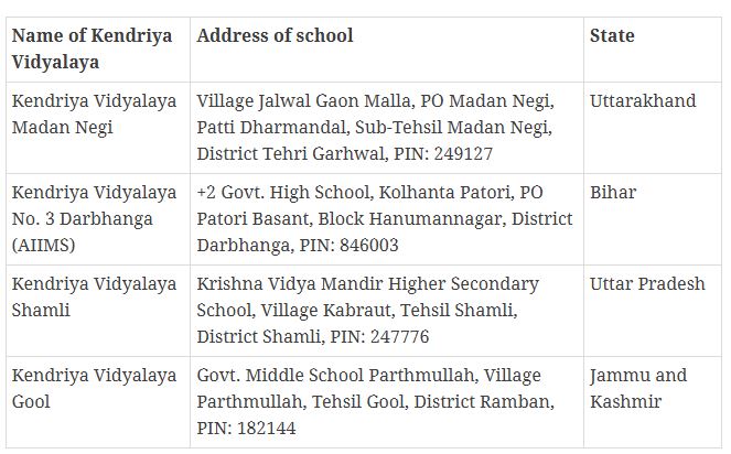 Recently, the government cleared institutions in Kendriya Vidyalaya Gool in Ramban district of Jammu & Kashmir, Kendriya Vidyalaya No. 3 Darbhanga (AIIMS) in Bihar, Kendriya Vidyalaya Madan Negi in Tehri Garhwal and Kendriya Vidyalaya Shamli in Uttar Pradesh.