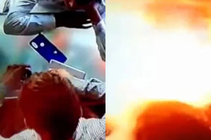 The local police said that the young man went to the cell phone store because his phone wouldn’t charge. In the CCTV footage, the young man can be seen standing in front of the shop counter with his phone on the glass counter. The cover of the phone can be seen to be open. While this is going on, the shopkeeper tries to take the phone’s battery out with a tool, but there is an explosion in less than a second. When people and store owners saw the fire, they left.