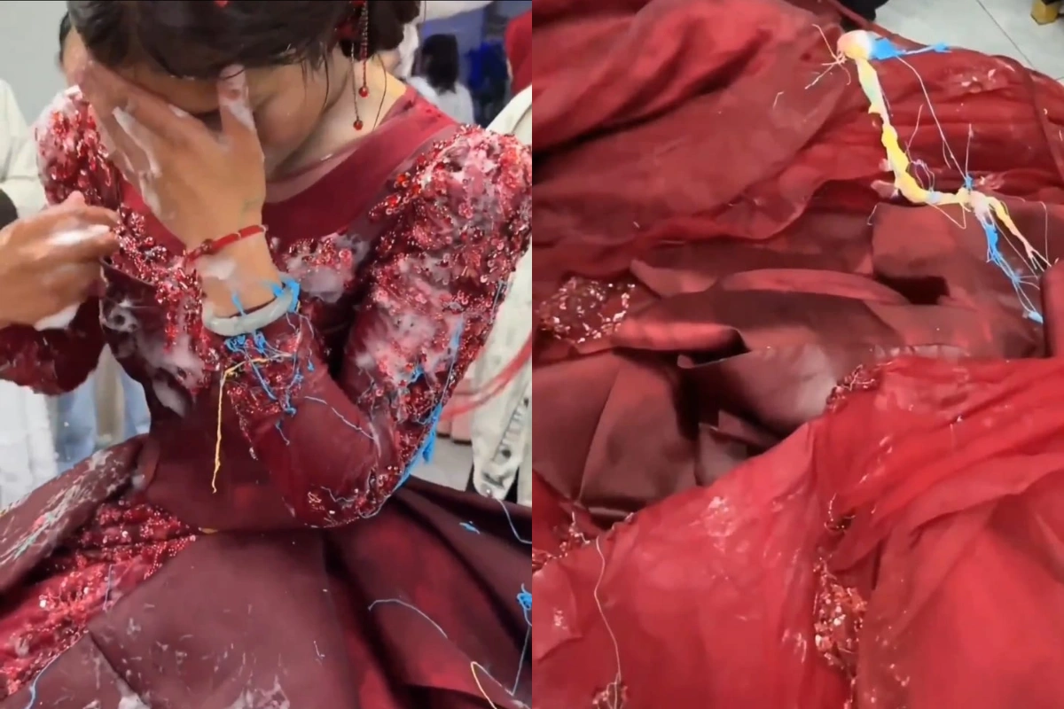 In the viral clip, a beautifully dressed bride is seen standing during her wedding ceremony when suddenly people around her begin spraying white foam all over her. Within seconds, her entire look, makeup, hairstyle, and outfit get ruined. The situation, which may have been intended as a playful act, quickly escalates. The bride appears visibly uncomfortable and tries to cover her face as the foam spreads across her. Social media users reacting to similar foam-related wedding clips have pointed out how such moments often turn chaotic, even making the bride look unrecognizable due to excessive foam.
