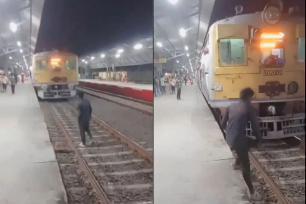 Viral Video: In today’s social media era, people even put their lives at risk, regardless of the places, to gain popularity by making reels, in the shortest possible time. For this, they go to any extent—making reels at rivers, oceans, railway tracks, etc—without considering the fatal consequences of stunts they perform. A viral video has surfaced on a social media that lays focus a young man, who walks on railway track against the moving train. But, later he escapes out to save himself—moving onto the railway platform.