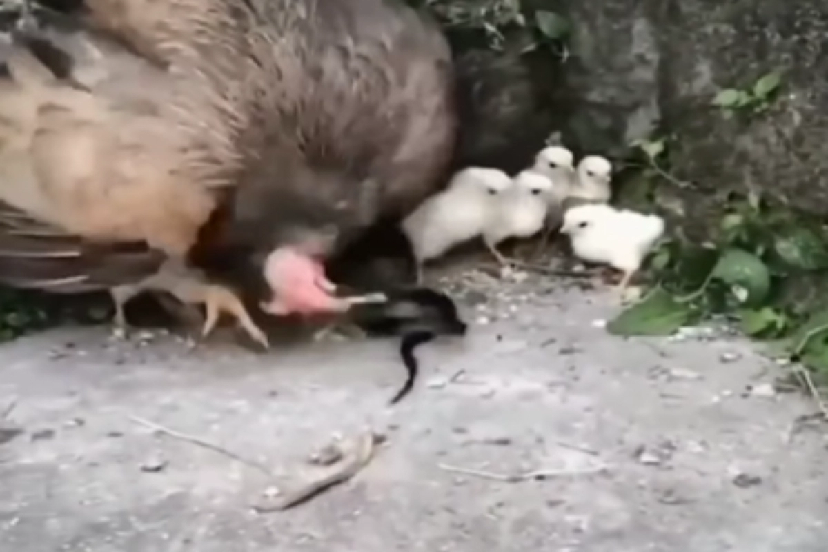 The mother hen is seen in the video frantically pecking and flapping her wings to keep the baby snake away from her young, who is in danger. The mother hen confronts the snake bravely and doesn’t back down in her mission to protect her brood, even though the snake keeps trying to prey on the helpless chicks.