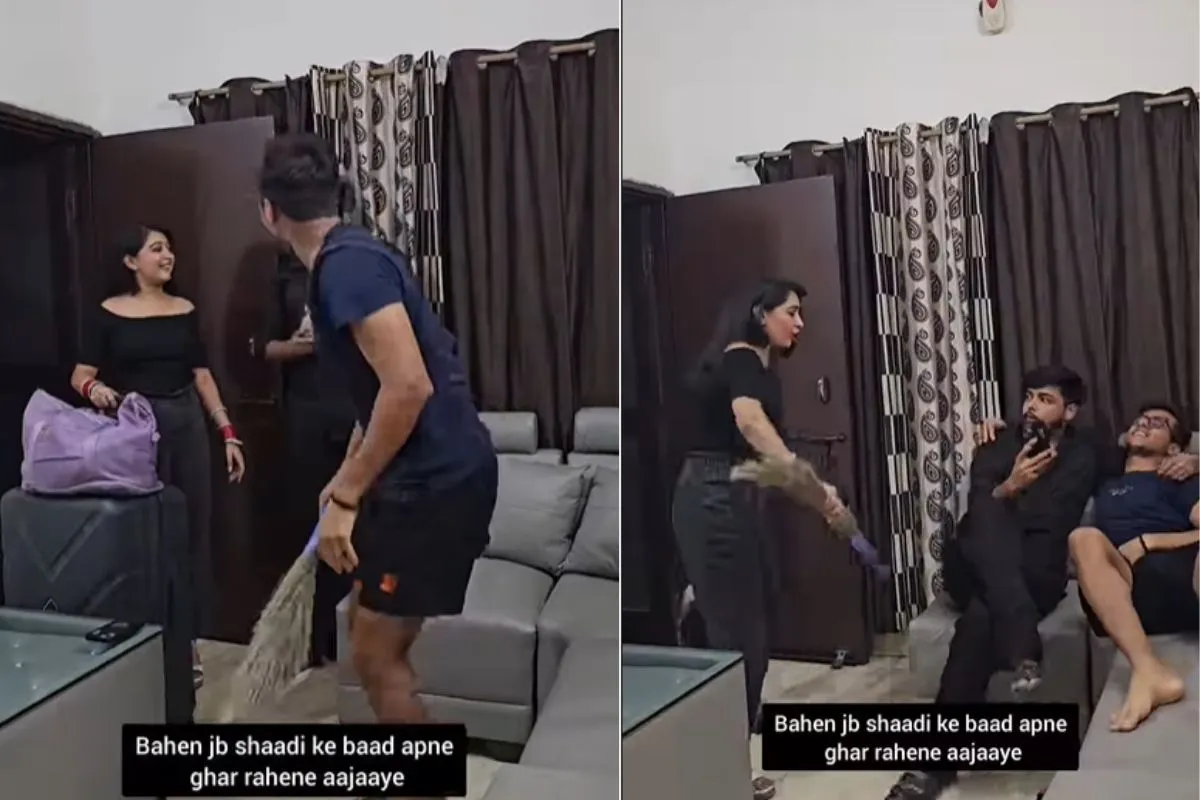 When sister enters her home, one of the brothers, who is brooming the room, hands over his broom to her to let her do what he is doing. Another brother, who is cleaning the walls with a piece of cloth, gives cloth to her to let her do what he is doing. One of them says to mother, “Ask maid not to come our home for a month.” The sister feels aggrieved and thrashes both brothers with a broom. The content creator has created the content of this video for fun purposes.