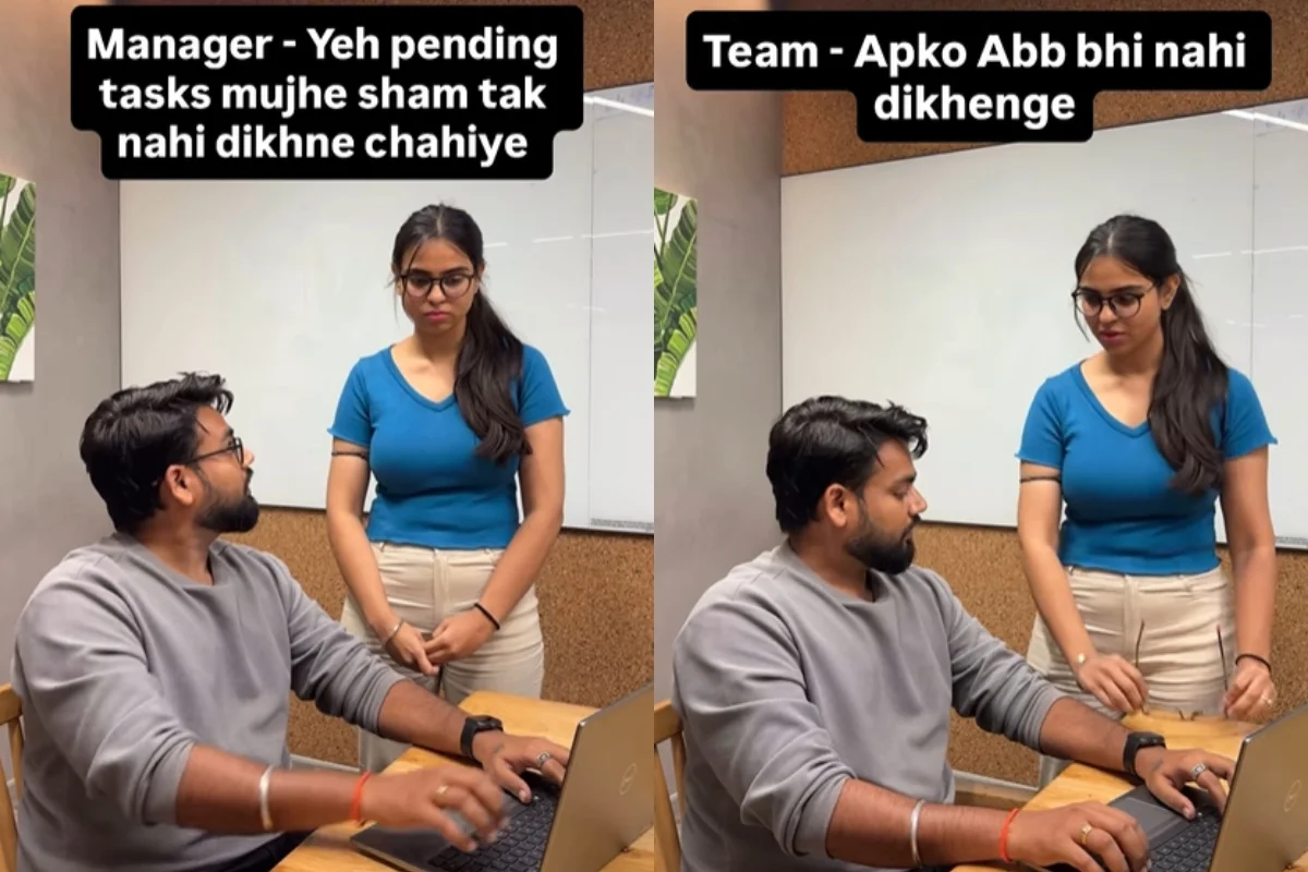 A viral video is spiralling across the internet, showing a manager telling an employee, “Yeh task mujhe shaam tak chahiye.” Without warning, the employee reaches out, removes the manager’s glasses, cheekily saying, “Ab apko nahi dikhega.” She then dashes out of the frame, leaving the room wide-eyed.