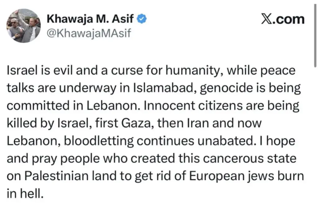 Asif remarked on X that genocide is being committed in Lebanon as peace talks are getting underway in Islamabad. Asif went on to write that innocent citizens are being killed by Israel, first Gaza, then Iran and now Lebanon, bloodletting continues unabated. The Pakistani defence minister also write that he hopes that the people who created this cancerous state on Palestinian land to get rid of European Jews burn in hell.